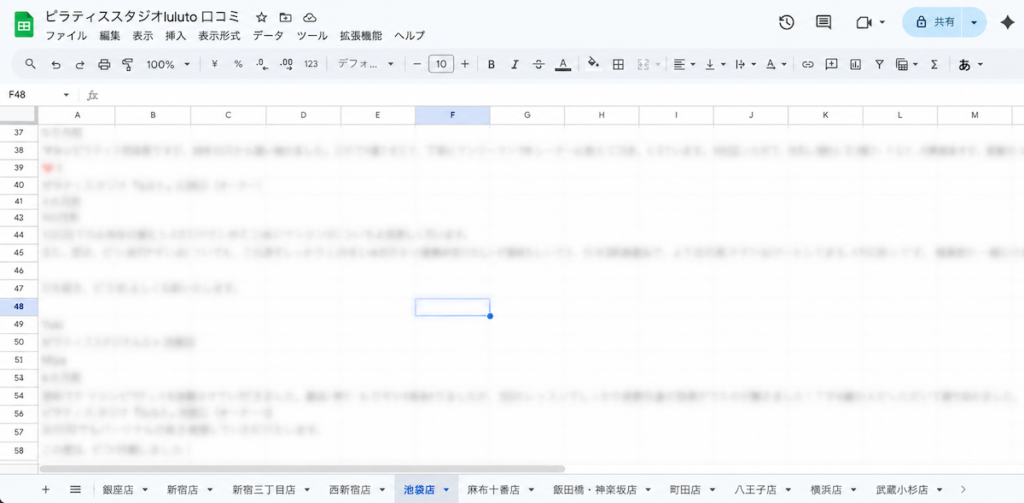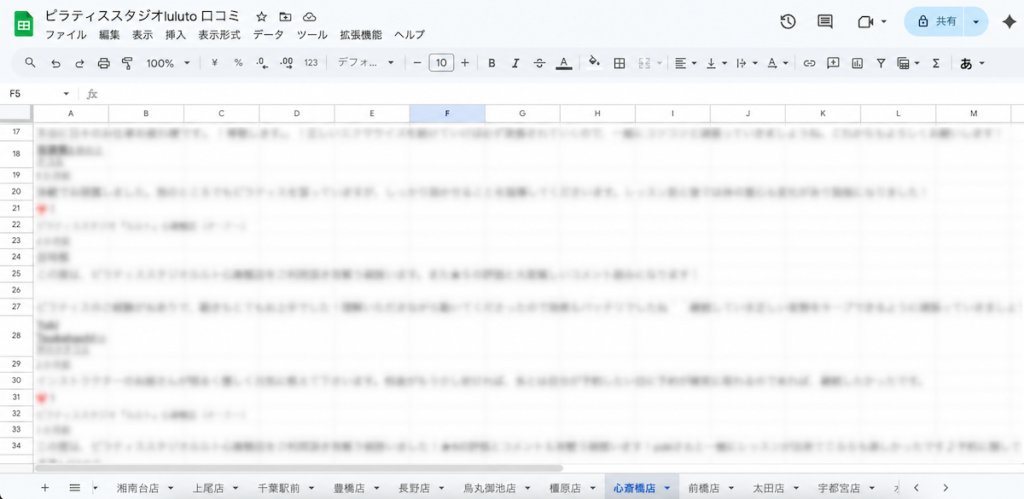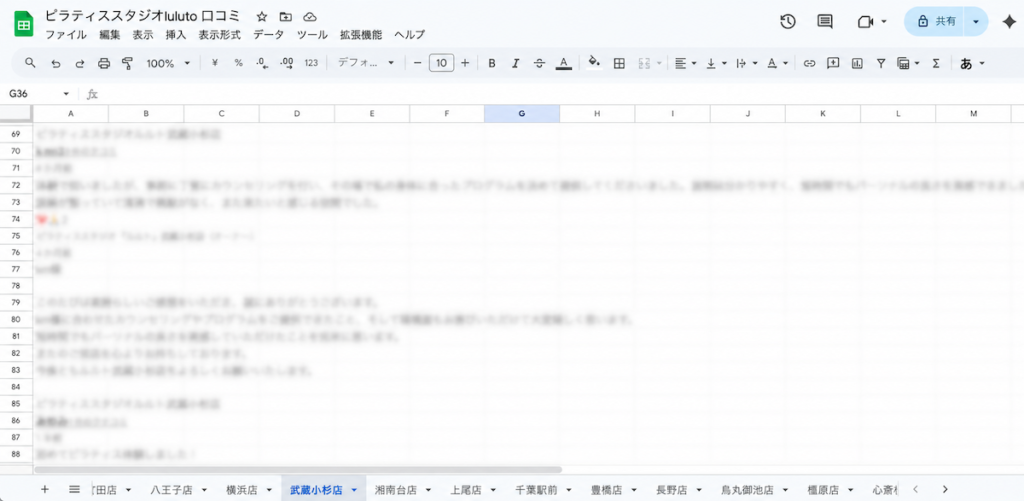 スプレッドシートを使用し、30店舗分のGoogleマップの口コミを調査しました。