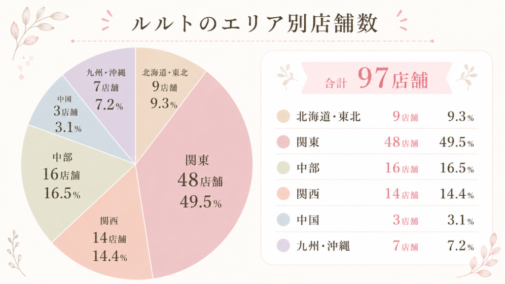90店舗以上に展開するルルトの店舗の中で、全国満遍なく抽出した30店舗の口コミを調査していきます。