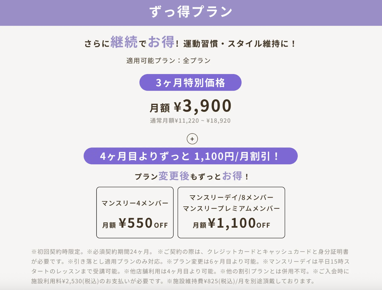 マンスリーメンバーは施設維持費として、月額¥825が別途かかります。