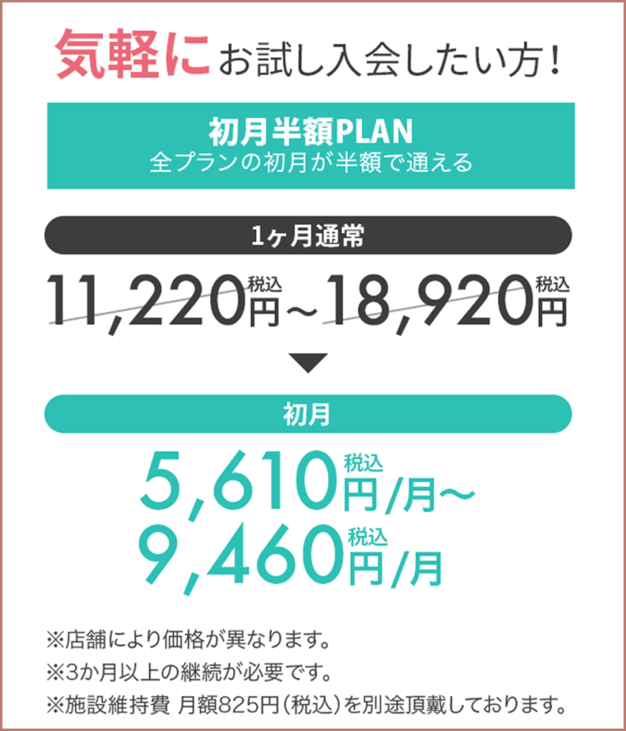 まずは気軽にお試ししたい方は、初月半額プランを選びましょう。3ヶ月通ってみて続けるかどうか決められます!