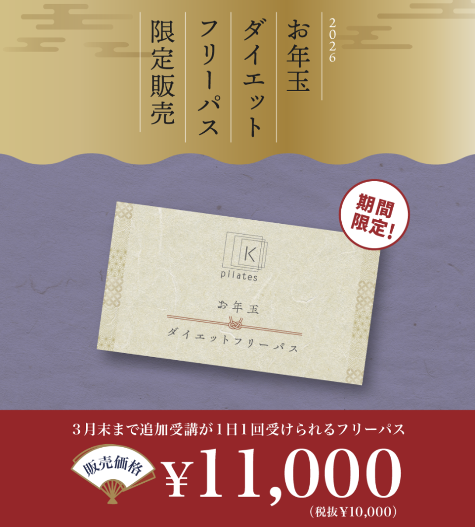 ピラティスKでは、2026年3月末まで使える”ダイエットフリーパス(チケット)”が店頭にて数量限定販売しています。