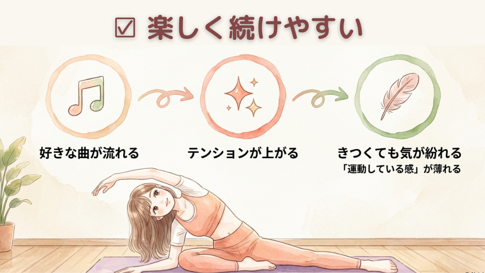 音楽に合わせて動くピラティスKは、無理なく楽しみながら続けたい人におすすめです。