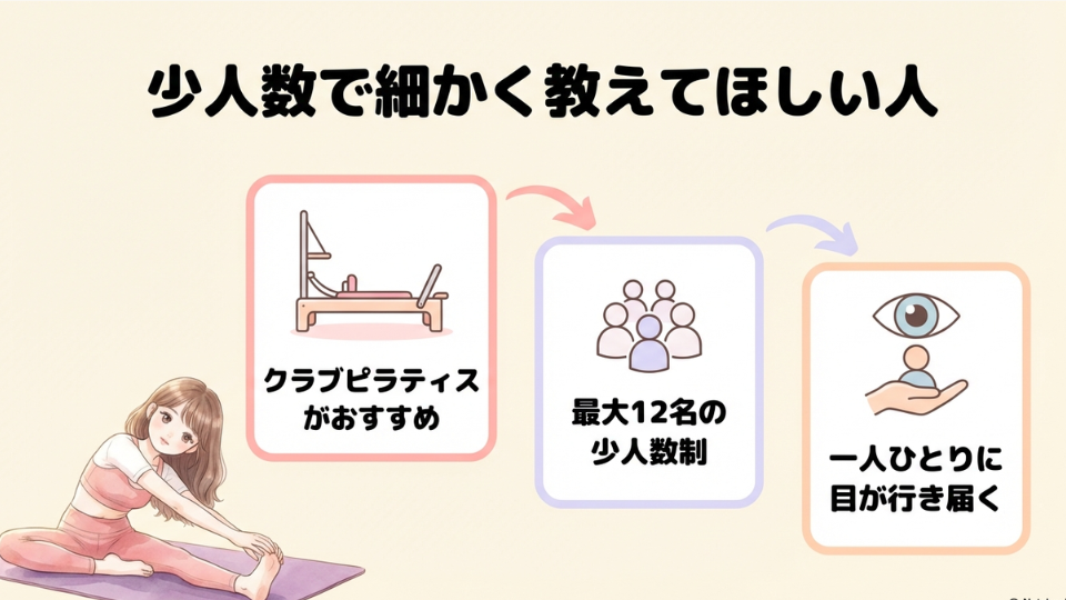 少人数レッスンで個別に細かく教えてほしい人は、クラブピラティスが向いています。