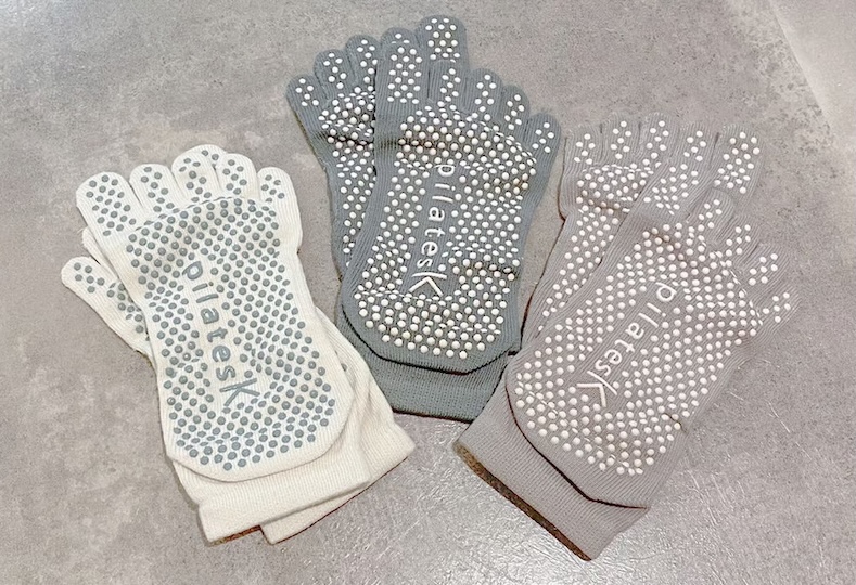 ピラティスは足裏を固定して動いたり、踏ん張ったりする動きも多いので、足が滑ると危ないです。レッスンに集中するためにも、できるだけ滑り止めつきの靴下を揃えましょう。