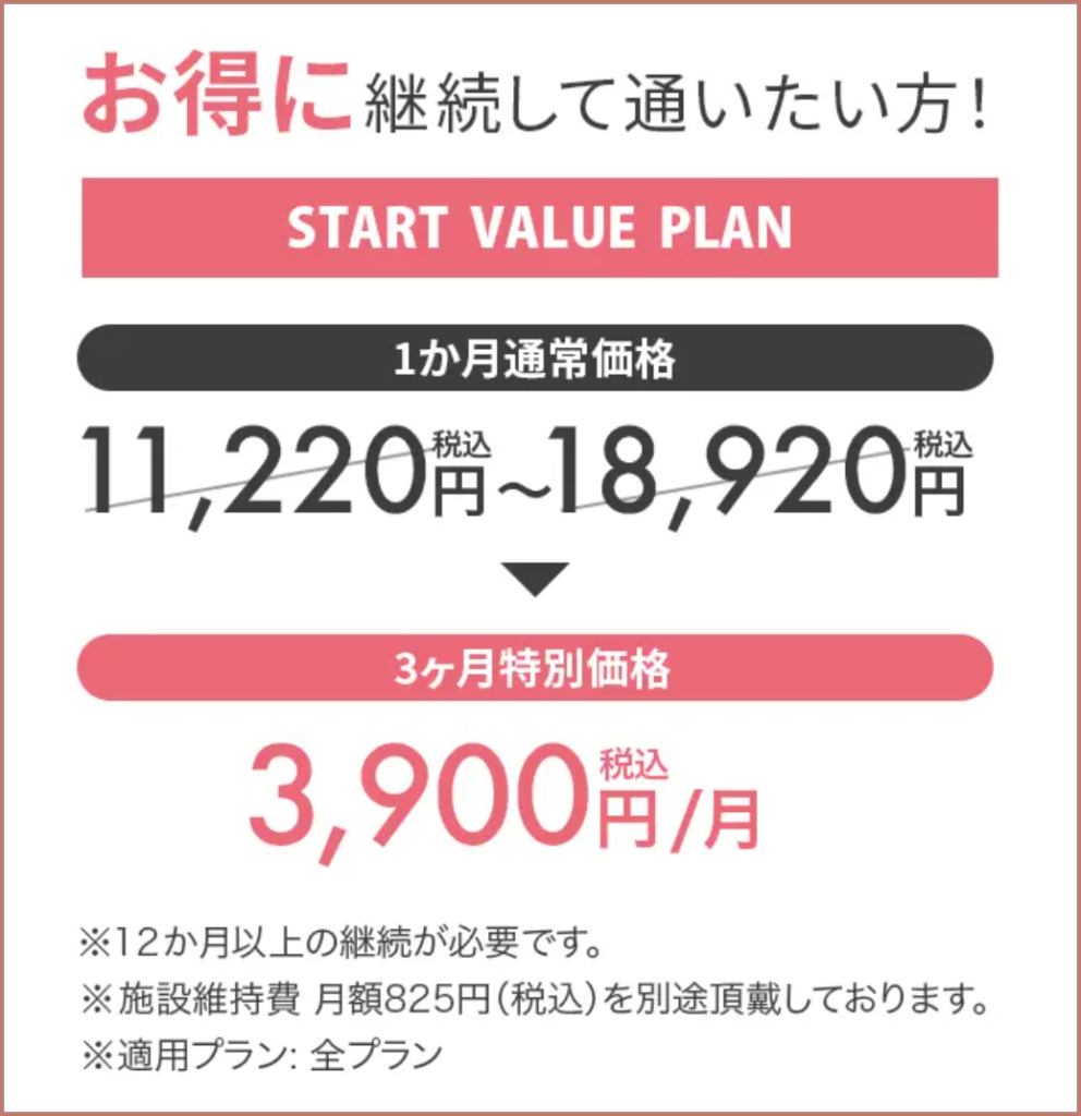 スタートバリュープランは、マンスリー8メンバーが3ヶ月間、最大75%オフで通えます。12ヶ月以上の継続が適用条件です。