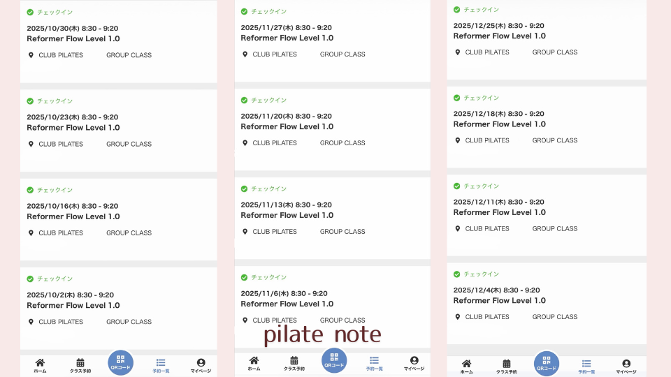 クラブピラティスでは、入会前でも予約スケジュールを見れば、実際の空き状況を店舗ごとに確認できます。特にピンポイントで通いたい時間帯がある人は、必ず体験前に確認しておきましょう。